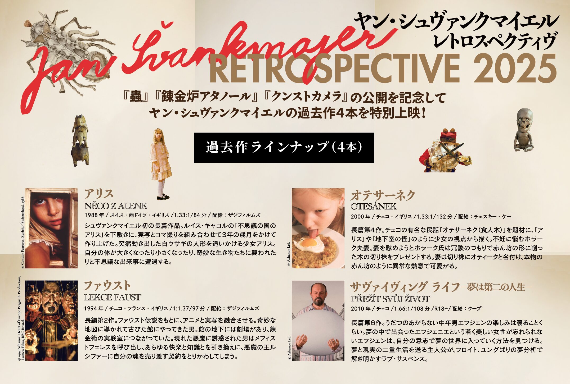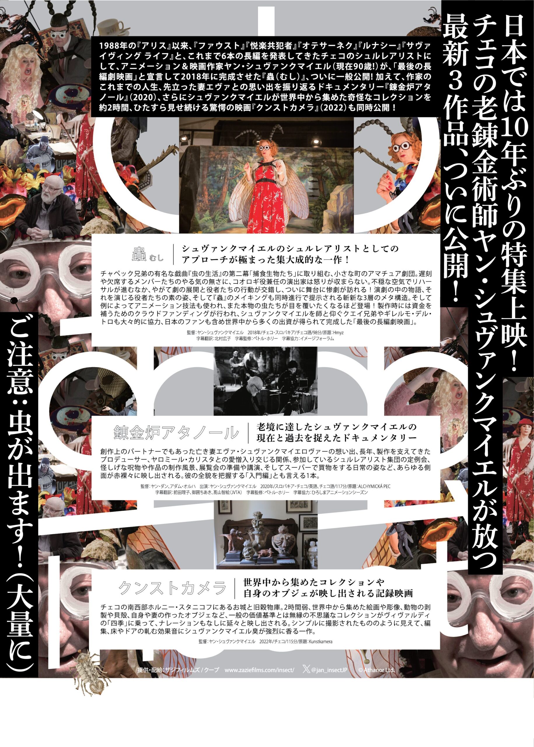 チェコのシュルレアリストにしてアニメーション&映画作家ヤン・シュヴァンクマイエルが「最後の長編劇映画」と宣言して2018年に完成させた『蟲』と、シュヴァンクマイエルの現在と過去を捉えたドキュメンタリー『錬金炉アタノール』(2020/ヤン・ダニヘル&アダム・オリハ監督)、自身の奇怪なコレクションを見せ続ける驚愕の映画『クンストカメラ』(2022)を上映。加えてシュヴァンクマイエル・レトロスペクティブとして初長編作『アリス』(1988)、長編第2作『ファウスト』(1994)、長編第4作『オテサーネク』(2000)、長編第6作『サヴァイヴィング ライフ -夢は第二の人生-』(2010)も一挙上映!今年91歳となったハイパーコマ撮り映画作家の世界最高峰の巨匠を術をどうぞ存分に浴びてください!