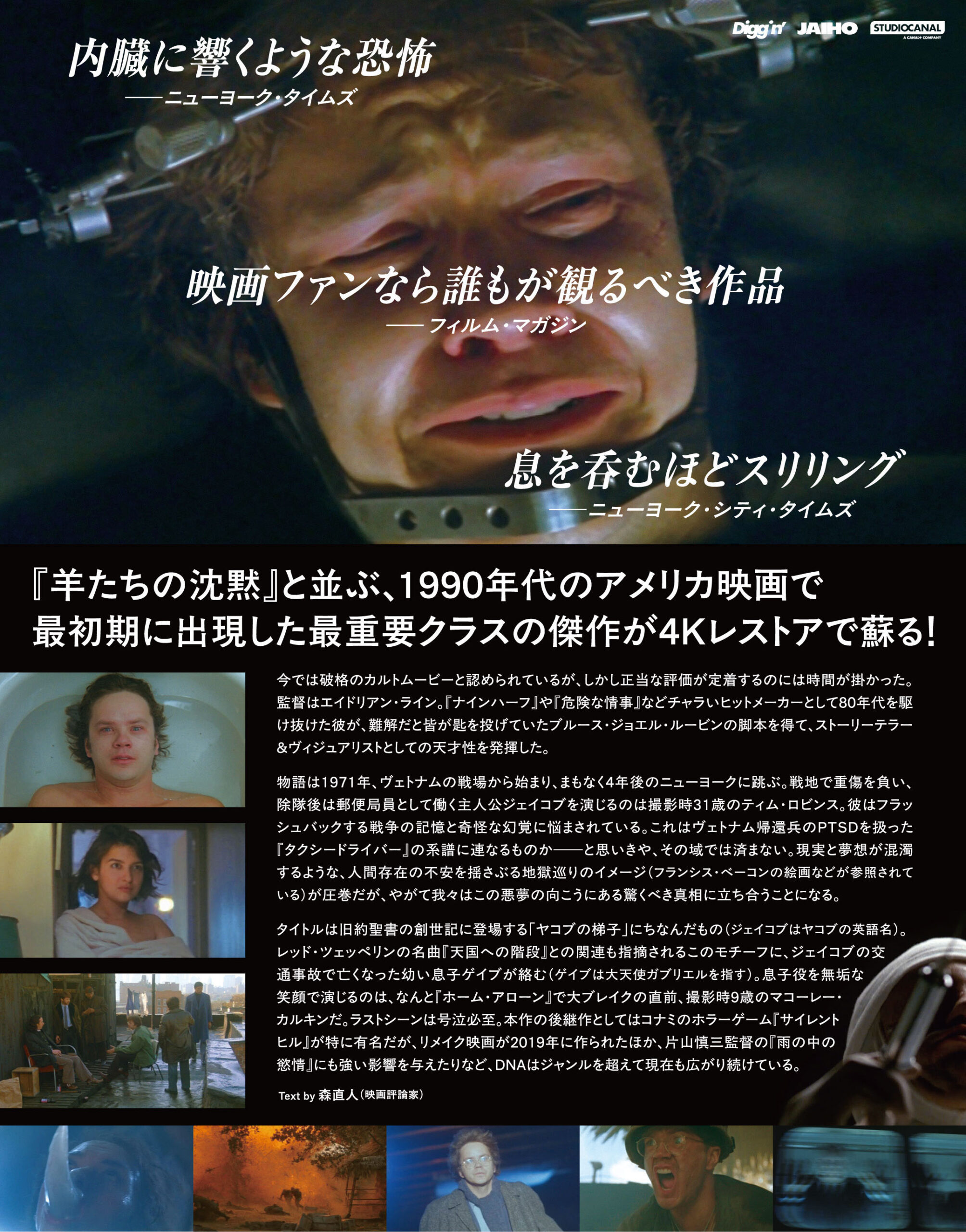 タイトルは旧約聖書の創世記に登場する「ヤコブの梯子」にちなんだもの(ジェイコブはヤコブの英語名)。レッド・ツェッペリンの名曲『天国への階段』との関連も指摘されるこのモチーフに、ジェイコブの交通事故で亡くなった幼い息子ゲイブが絡む(ゲイブは大天使ガブリエルを指す)。息子役を無垢な笑顔で演じるのは、なんと『ホーム・アローン』で大ブレイクの直前、撮影時9歳のマコーレー・カルキンだ。ラストシーンは号泣必至。本作の後継作としてはコナミのホラーゲーム『サイレントヒル』が特に有名だが、リメイク映画が2019年に作られたほか、片山慎三監督の『雨の中の慾情』にも強い影響を与えたりなど、DNAはジャンルを超えて現在も広がり続けている。