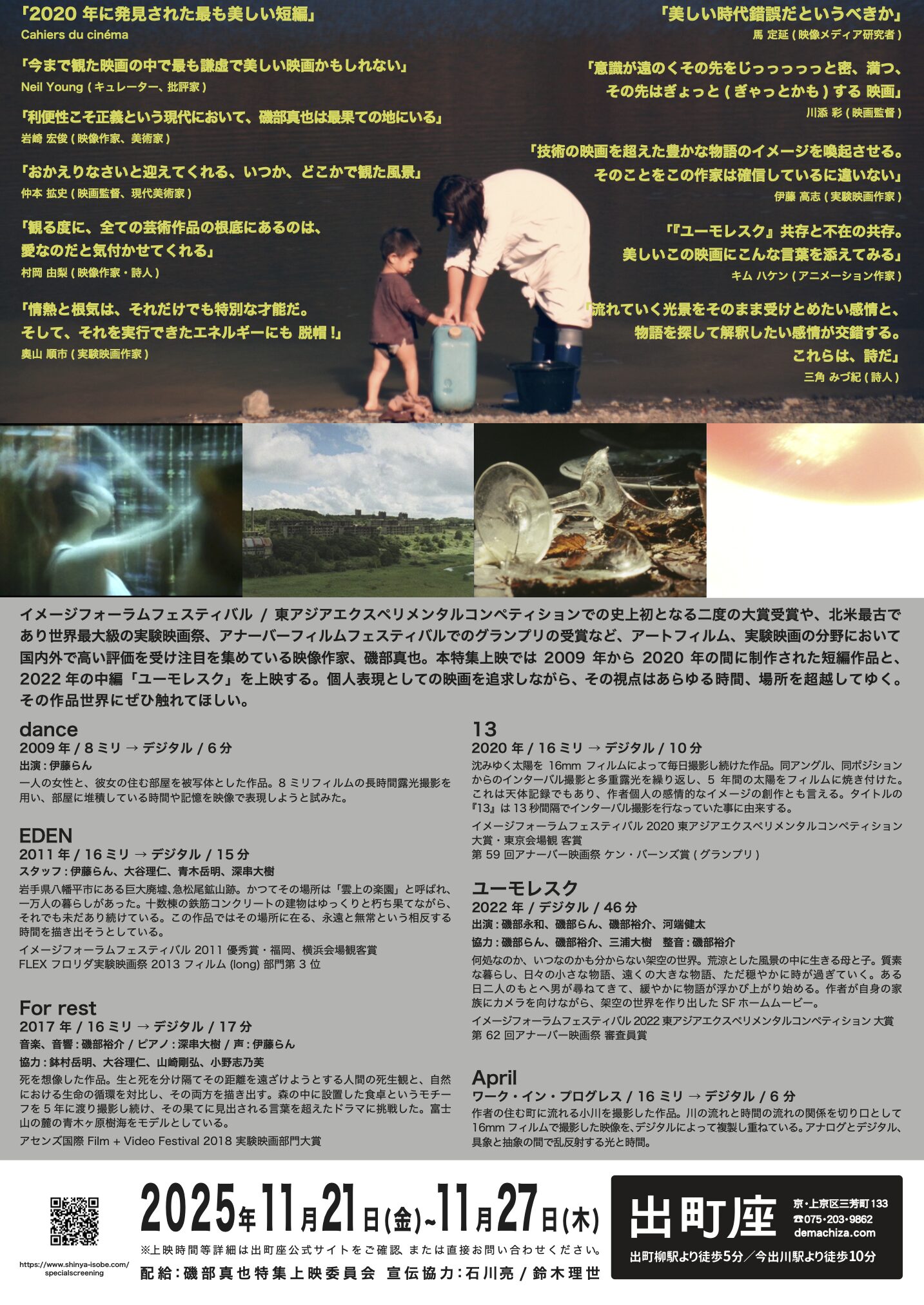 イメージフォーラムフェスティバル / 東アジアエクスペリメンタルコンペティションでの史上初となる二度の大賞受賞や、北米最古で あり世界最大級の実験映画祭、アナーバーフィルムフェスティバルでのグランプリの受賞など、アートフィルム、実験映画の分野において 国内外で高い評価を受け注目を集めている映像作家、磯部真也。本特集上映では 2009 年から 2020 年の間に制作された短編作品と、 2022 年の中編「ユーモレスク」を上映する。個人表現としての映画を追求しながら、その視点はあらゆる時間、場所を超越してゆく。 その作品世界にぜひ触れてほしい。