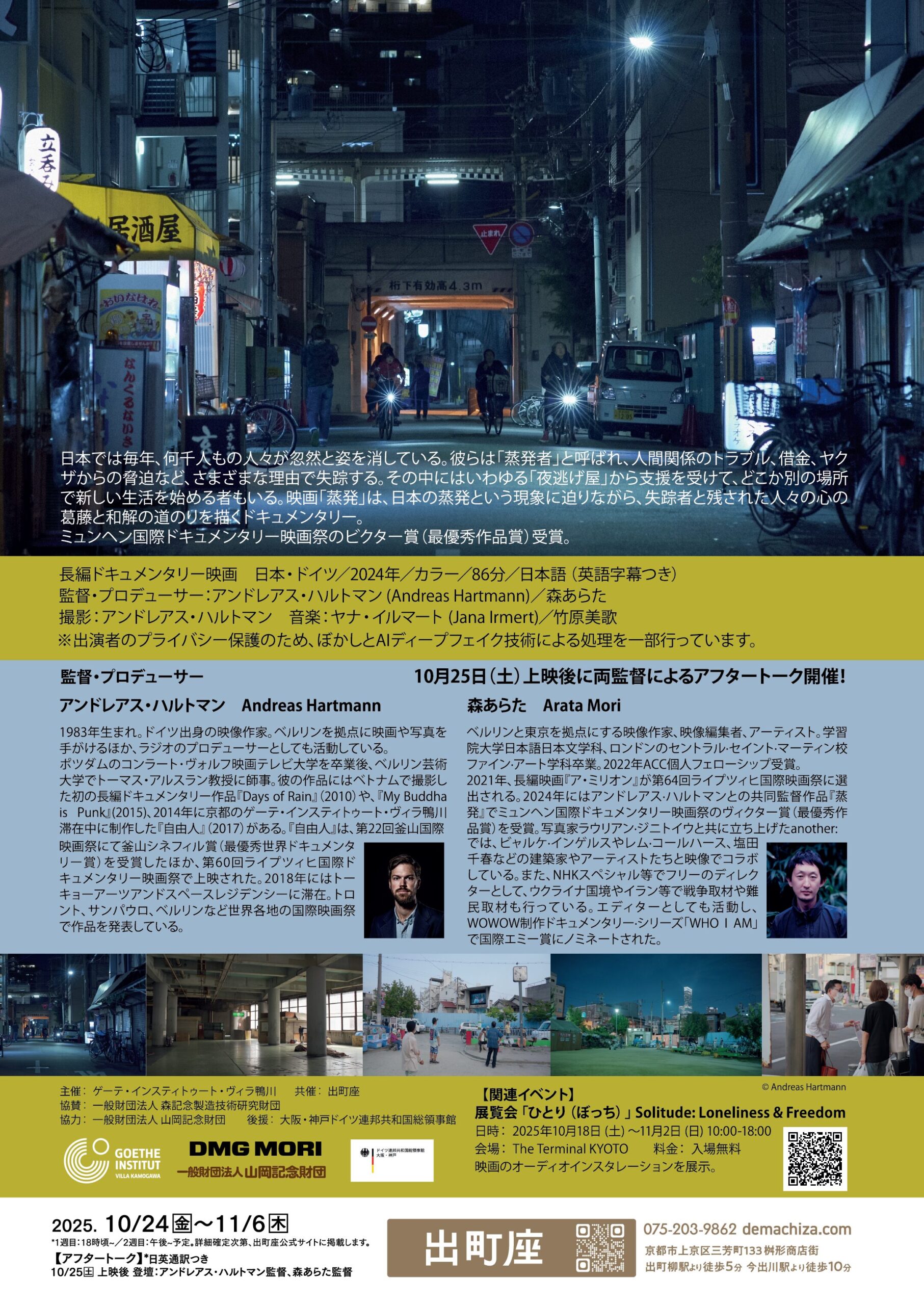 日本では毎年、何千人もの人々が忽然と姿を消している。彼らは「蒸発者」と呼ばれ、人間関係のトラブル、借金、ヤクザからの脅迫など、さまざまな理由で失踪する。その中にはいわゆる 「夜逃げ屋」から支援を受けて、どこか別の場所で新しい生活を始める者もいる。映画『蒸発』は、日本の蒸発という現象に迫りながら、失踪者と残された人々の心の葛藤と和解の道のりを描くドキュメンタリー。今年春の第20回 大阪アジアン映画祭でジャパンプレミア上映を果たして、今回は出町座単独で日本の劇場初上映となります。アンドレアス・ハルトマン、森あらた両監督のアフタートークもあり。