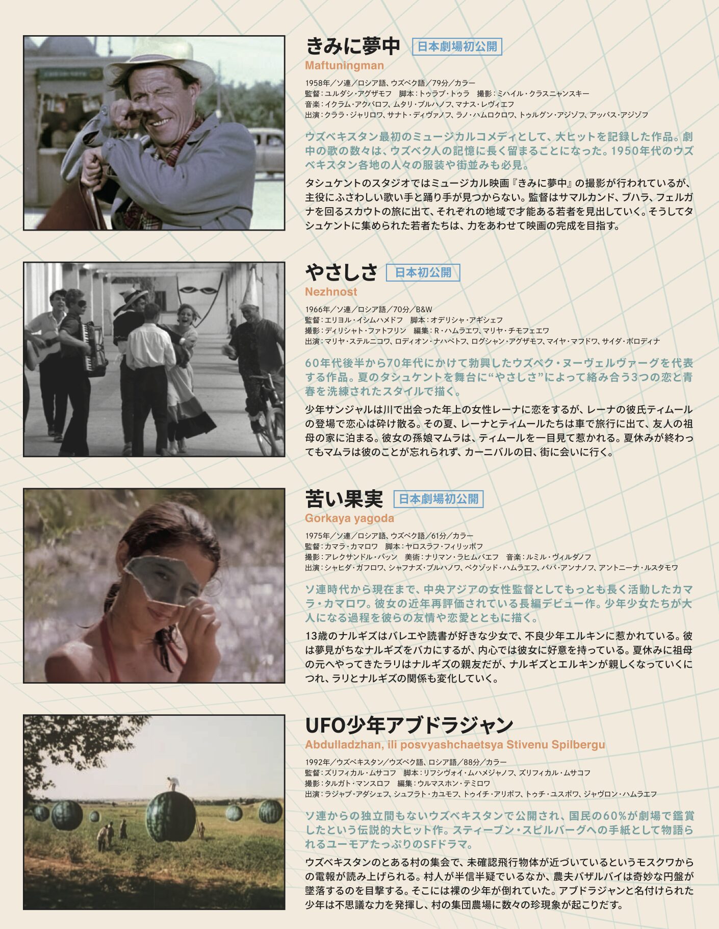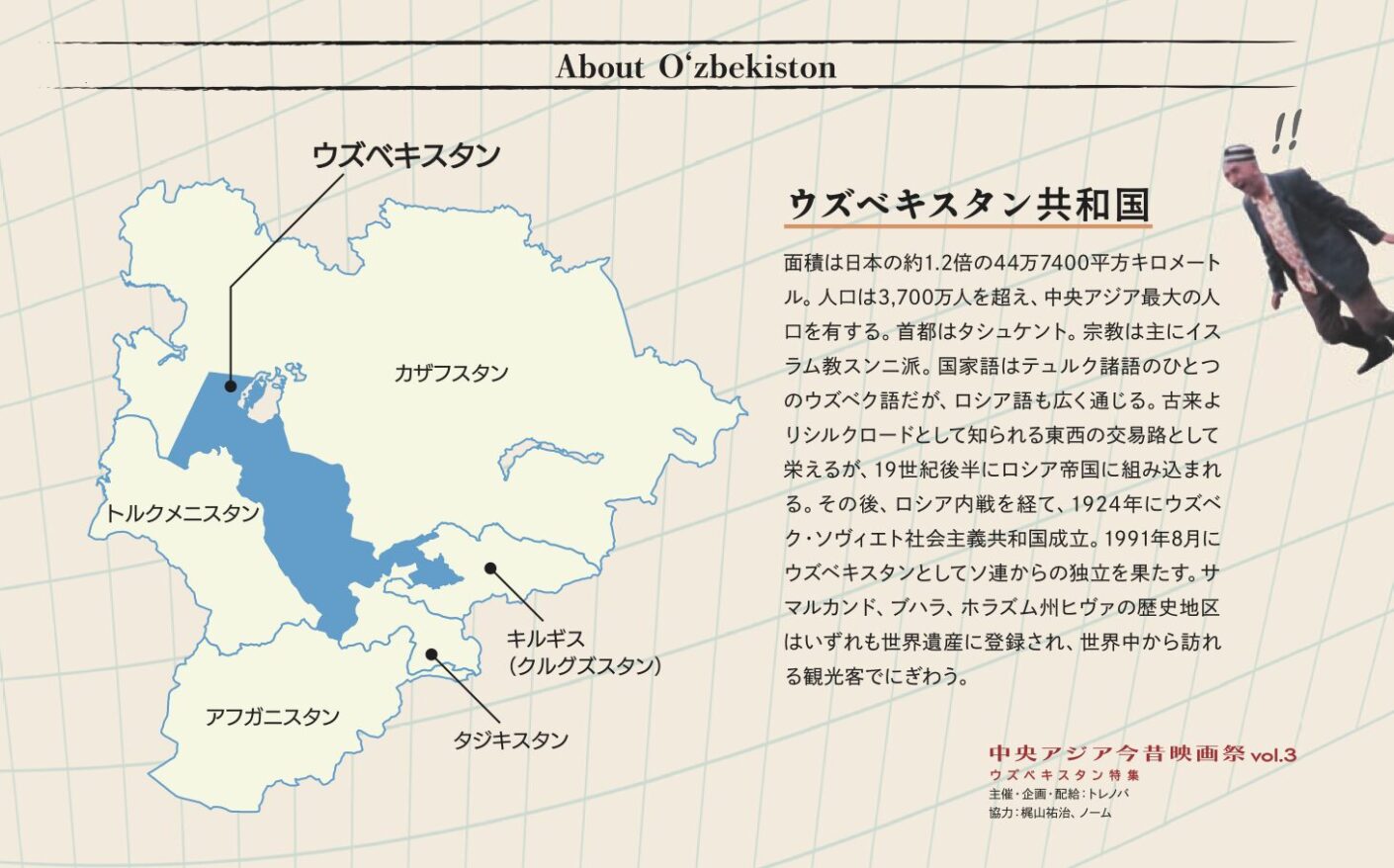 中央アジアのほぼ中心に位置するウズベキスタン。 激動の長い歴史を経たこの国は、現在中央アジア諸国最大の人口を有し、著しい経済成長を続けている。そしてこの国は、欧州・中東・アジアの歴史・文化が交わり、独自の映画が生み出されてきた知られざる映画大国でもある。中央アジア今昔映画祭 第3弾は、ウズベキスタンの旅へ。