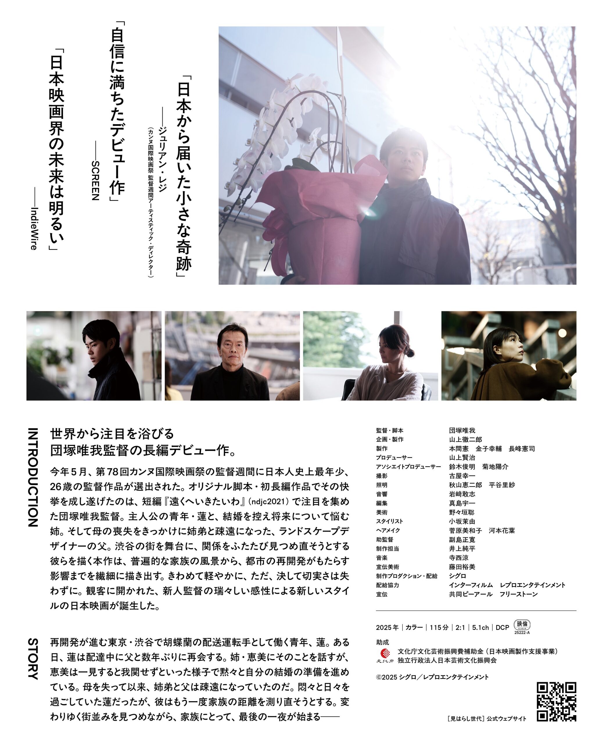 世界から注目を浴びる団塚唯我監督の長編デビュー作にして、今年、第78回カンヌ映画祭の監督週間に選出された本作。日本人史上最年少の26歳の若さでオリジナル脚本・初長編作品を完成させた団塚唯我監督が果たした快挙である。主人公の青年・蓮と、結婚を控えた姉。そして母の喪失をきっかけに姉弟と疎遠になったランドスケープデザイナーの父。渋谷の街を舞台に、一度は壊れてしまった関係を再び見つめ直そうとする彼らを、普遍的な家族の風景から、都市の再開発がもたらす影響までを繊細に、そしてきわめて軽やかに、ただ決して切実さは失わずに描き出した。世界の観客に開かれた、新人監督の瑞々しい感性による新しいスタイルの日本映画が誕生した。