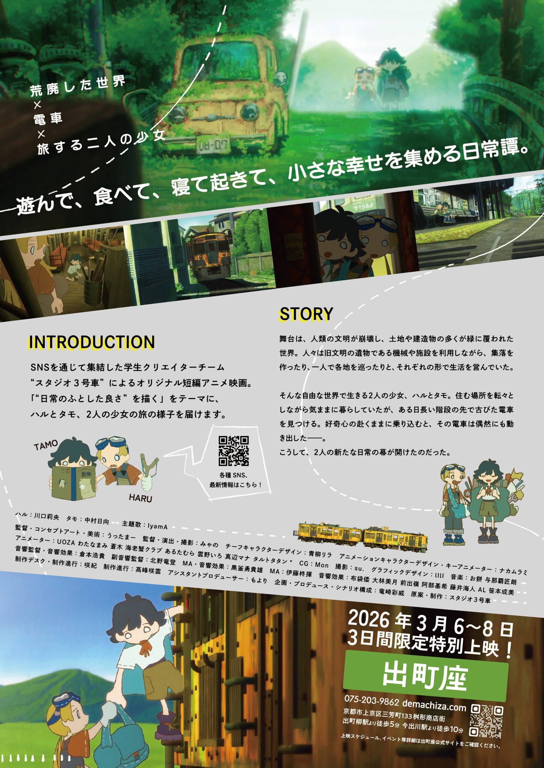 本作のためにSNSを通じて集結した総勢35名の学生クリエイター集団 “スタジオ3号車” による電車に乗って荒廃した世界を旅する2人の少女の日々を描く日常譚。