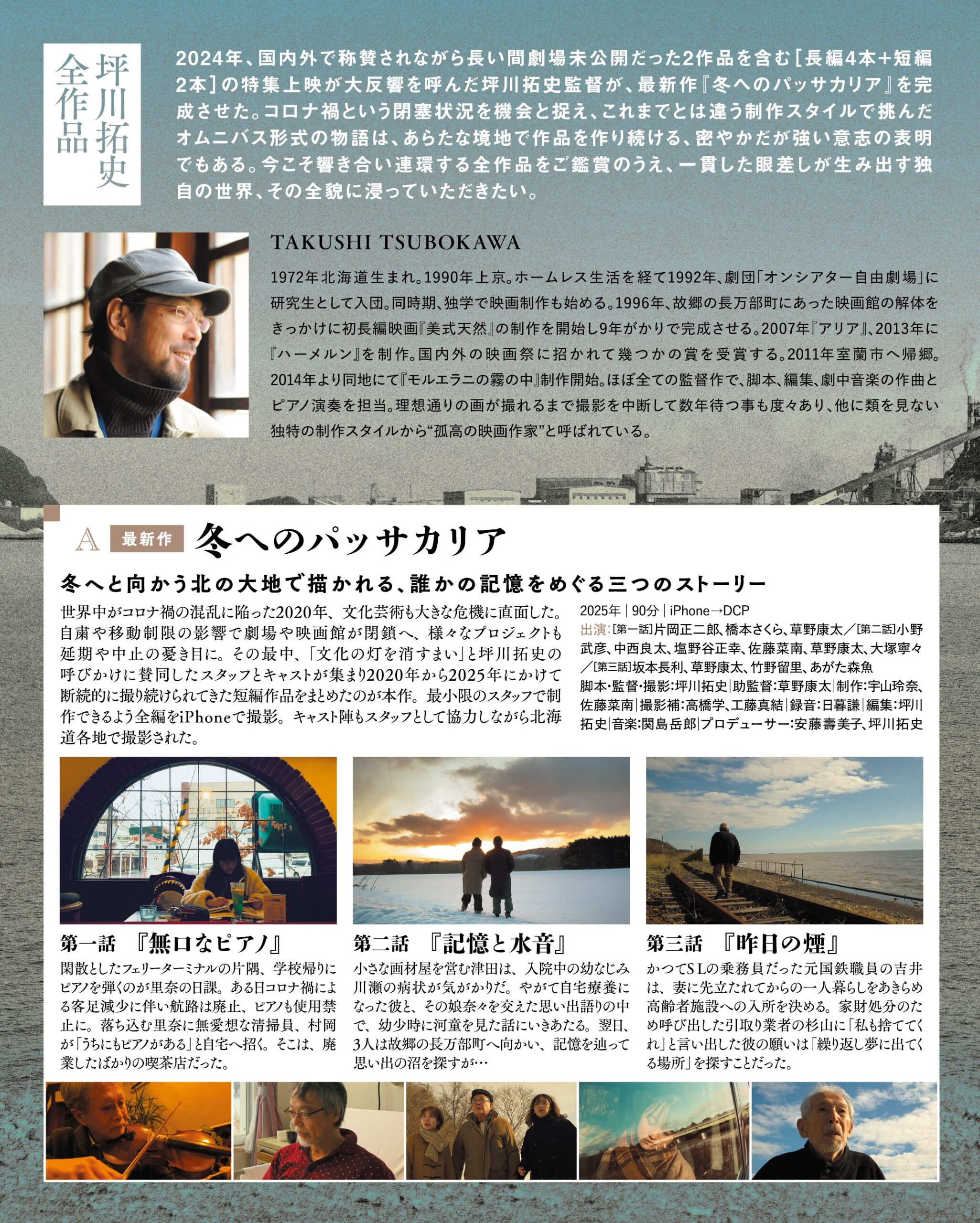世界中がコロナ禍の混乱に陥った2020年、文化芸術も大きな危機に直面した。自粛や移動制限の影響で劇場や映画館が閉鎖、様々なプロジェクトも延期や中止の憂き目に。その最中、「文化の灯を消すまい」と坪川拓史の呼びかけに賛同したスタッフとキャストが集まり2020年から2025年にかけて断続的に撮り続けられてきた短編作品をまとめたのが本作。最小限のスタッフで制作できるよう全編をiPhoneで撮影。キャスト陣もスタッフとして協力しながら北海道各地で撮影された。