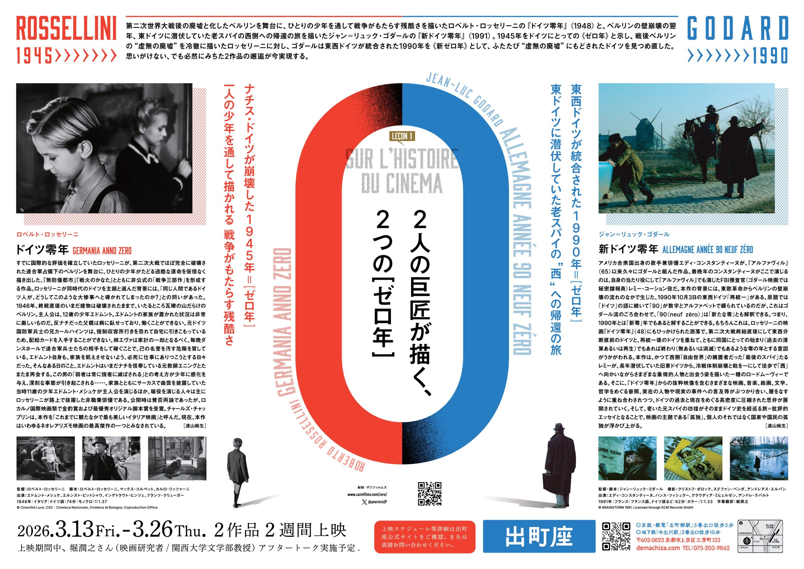 1945年をドイツにとっての《ゼロ年》と示し、戦後ベルリンの“虚無の廃墟”を冷徹に描いたロッセリーニに 対し、ゴダールは東西ドイツが統合された1990年を《新ゼロ年》として、ふたたび“虚無の廃墟”にもどされたドイツを見つめ直した。戦後80年、東西ドイツ統一35年を迎えた今、思いがけない、だが必然にみちた2作品の邂逅が実現する。