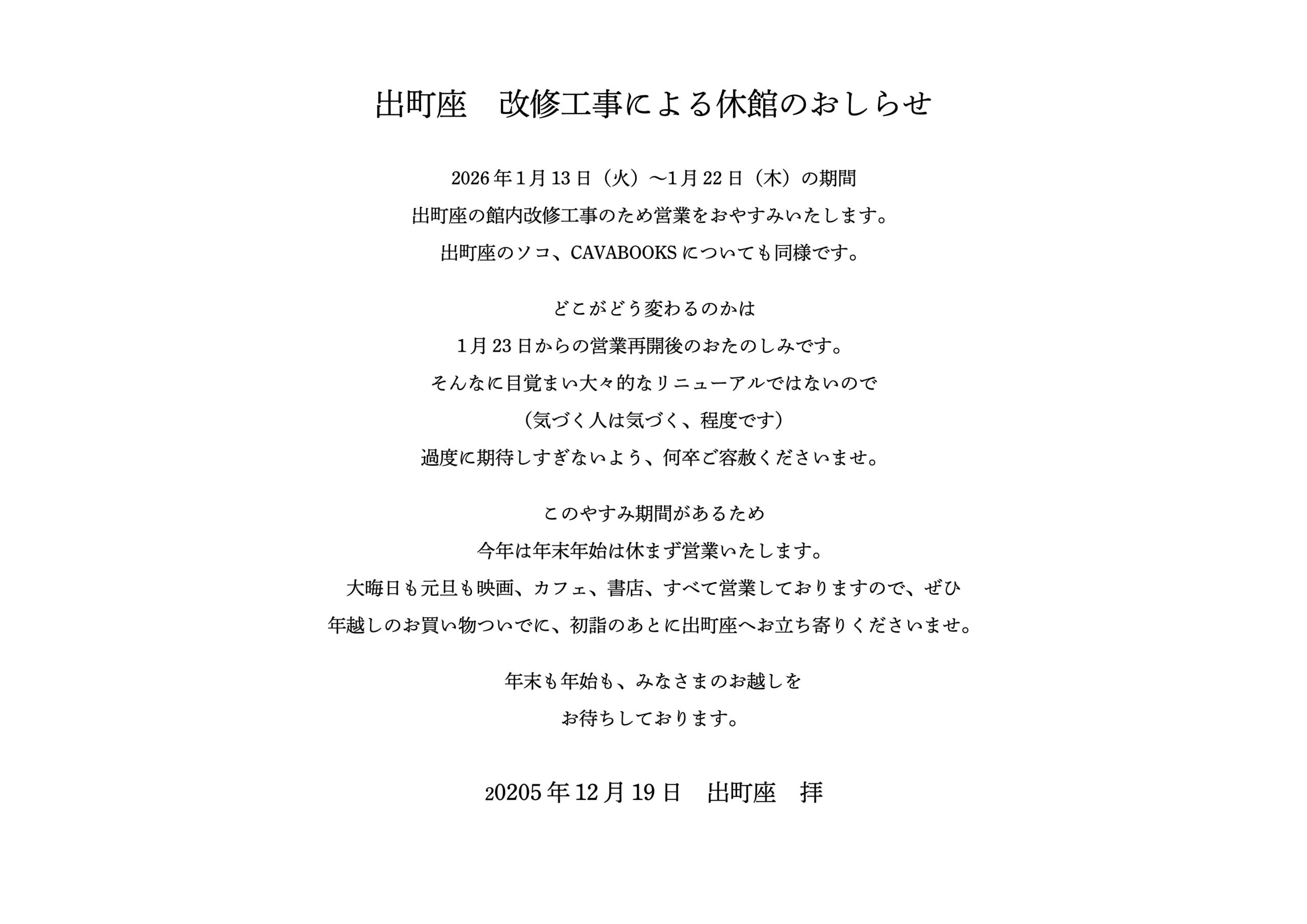 出町座 改修工事による休館のお知らせ