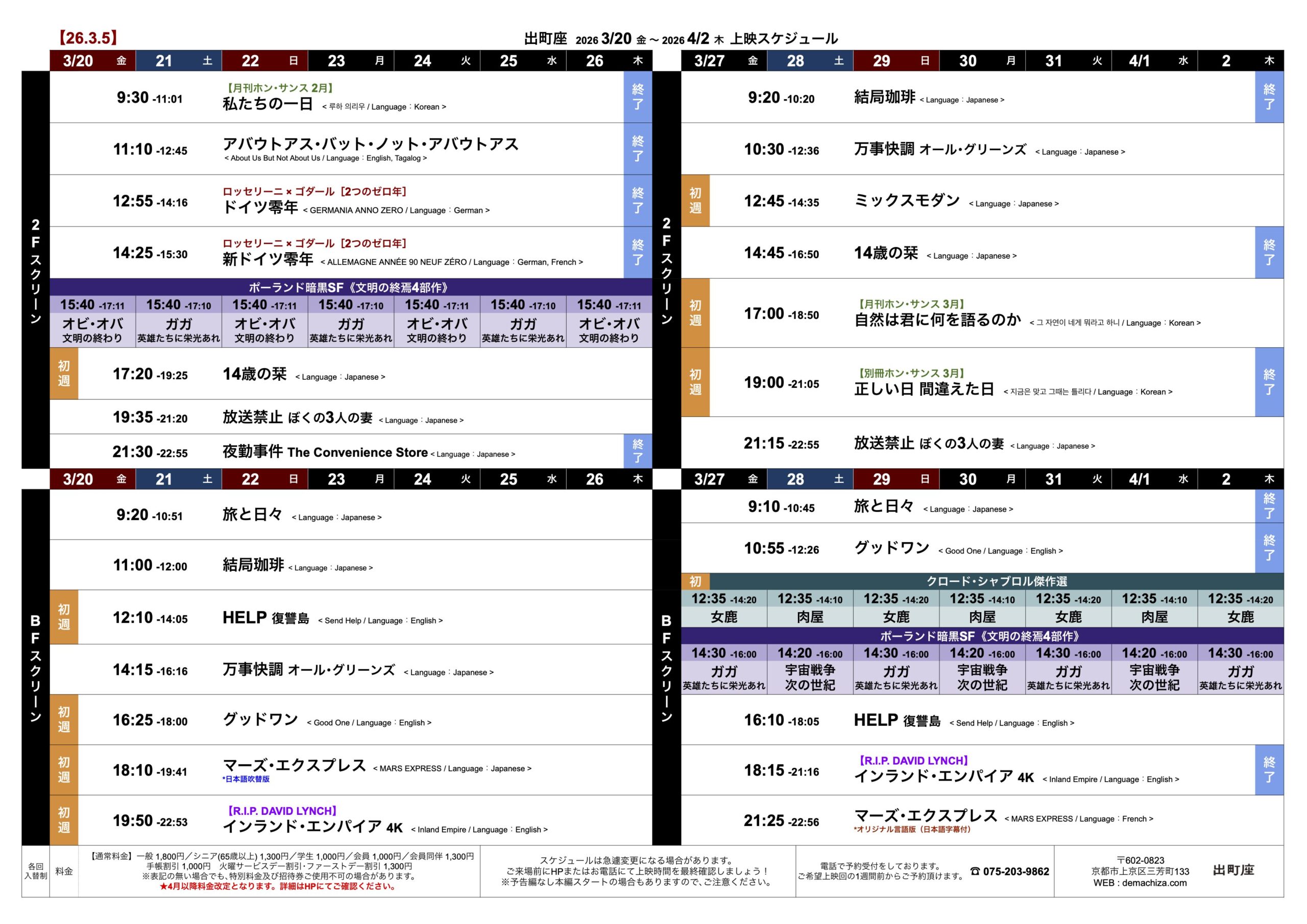 3/20 金 〜 4/2 木 の映画スケジュール【26.3.5】