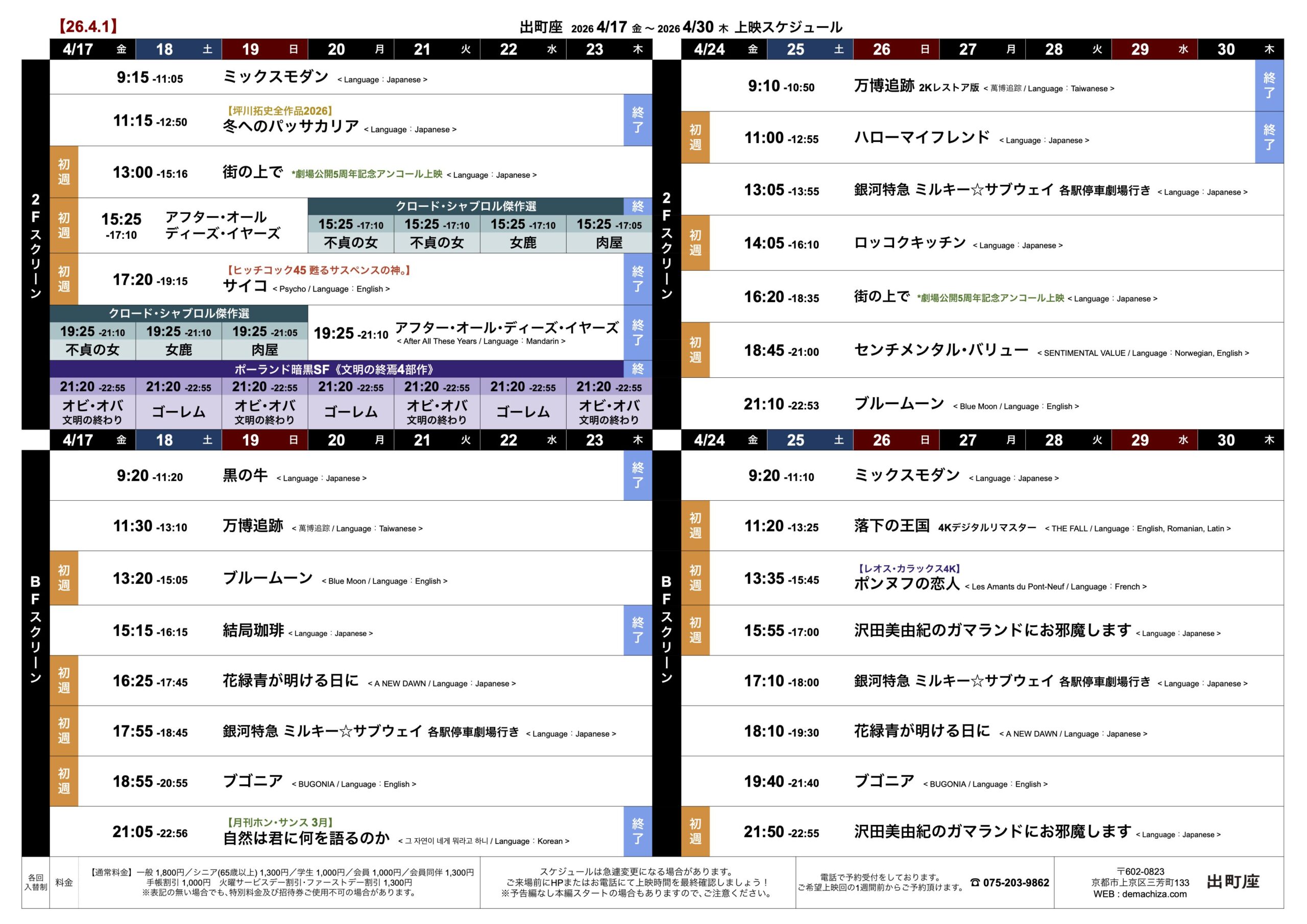 4/17 金 〜 4/30 木 の映画スケジュール【26.4.1】